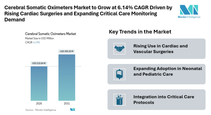 According to Mordor Intelligence, the cerebral somatic oximeters market continues to expand steadily as hospitals and surgical teams place greater emphasis on real-time oxygen monitoring to support patient safety. The cerebral somatic oximeters market size is valued at USD 215.56 million in 2026 and is expected to reach USD 290.33 million by 2031. This growth reflects wider adoption of cerebral oxygen monitoring during high-risk procedures, rising surgical volumes, and increased awareness of hypoxia-related complications across critical care settings.