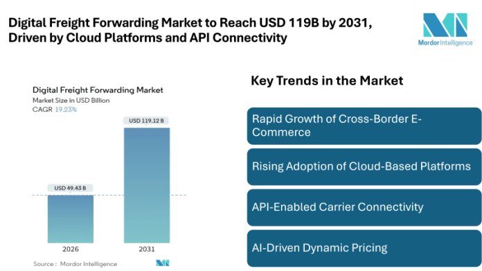 According to Mordor Intelligence the digital freight forwarding market size in 2026 is estimated at USD 49.43 billion, growing from 2025 value of USD 41.46 billion with 2031 projections showing USD 119.12 billion, growing at 19.23% CAGR. This growth is fueled by the increasing adoption of cross-border e-commerce, regulatory mandates for digital trade documentation, and the widespread implementation of cloud-based freight management solutions. The Asia-Pacific region leads the market due to strong manufacturing bases and supportive SME digitization programs, while North America and Europe are expanding through standardized carrier APIs and stringent data accuracy requirements.
