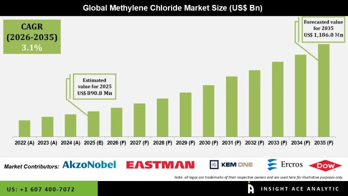 Methylene Chloride Market Size is valued at USD 890.8 Mn in 2025 and is predicted to reach USD 1,186.0 Mn by the year 2035 at a 3.1% CAGR during the forecast period for 2026 to 2035.