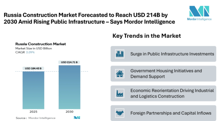According to Mordor Intelligence, the Russia construction market size stands at USD 184.43 billion in 2025 and is forecast to reach USD 214.71 billion by 2030, translating into a 3.09% CAGR. This growth is driven by sustained public infrastructure spending, housing initiatives, industrial expansion, and reconstruction efforts in newly integrated and war-affected territories. Despite high mortgage rates impacting urban apartment demand, Russia continues to record strong individual housing completions, underpinned by national-project funding and the expansion of logistics and industrial facilities.