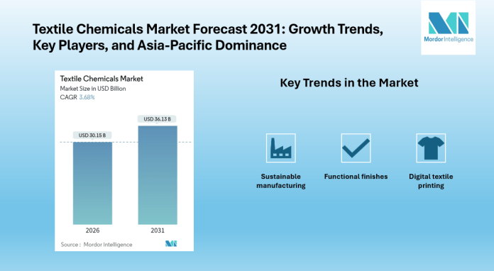 The global textile chemicals market is projected to grow from USD 30.15 billion in 2026 to USD 36.13 billion by 2031, registering a CAGR of 3.68%. Asia-Pacific leads the market with over 70% share, fueled by strong exports from China and India’s expanding textile industry. Key trends include demand for sustainable chemistry, digital textile printing, and functional finishes.