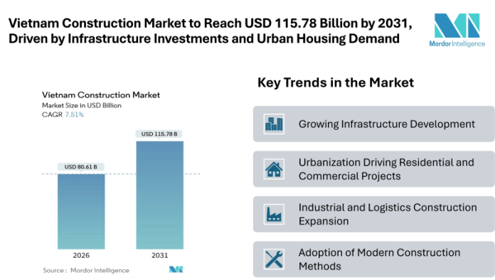 According to Mordor Intelligence, the Vietnam construction market size projected to grow from USD 80.61 billion in 2026 to USD 115.78 billion by 2031, reflecting a healthy growth rate. This growth is driven by government-backed infrastructure projects, rising foreign direct investment, and a steady rebound in residential and commercial construction. The current regulatory framework, including new real estate laws enacted in 2024, has improved project bankability and expedited permitting processes, encouraging both public and private sector participation.