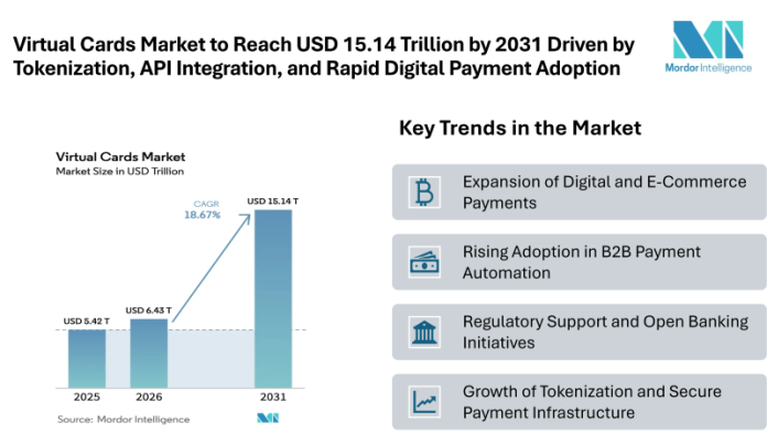 According to Mordor Intelligence, the virtual cards market size is expected to witness strong growth, expanding from USD 5.42 trillion in 2025 to USD 6.43 trillion in 2026, and reaching approximately USD 15.14 trillion by 2031. This reflects a robust compound annual growth rate of 18.67%. This rapid expansion is being fueled by the increasing convergence of payment systems and software platforms, enabling virtual cards to offer highly programmable and API-driven payment experiences. Innovations in tokenization are significantly enhancing transaction security, improving authorization rates, and reducing fraud across digital and in-app commerce environments. At the same time, the rise of open banking frameworks is streamlining funding and settlement processes by enabling standardized data sharing through APIs. Enterprises, particularly treasury departments, are accelerating adoption as virtual cards provide automated reconciliation, enhanced spend control, and improved working capital management.